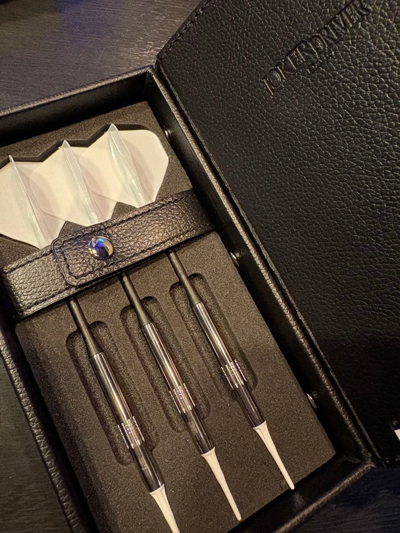 - とてもコンパクトで、カードは入りませんがダーツ1セット、チップ6本、フライト1〜2セット、前面のポケットにはシャフト等の小物が収納できます。革も厚手で高級感があり、あまり他人が持ってないのも良いですね。と、ここまでは良いのですが、使い勝手は難ありです。最初のうちは革が硬いというレベルではなく、ダーツホルダー部3本中、真ん中以外はダーツのセットが非常に困難です。直径7.4mmのバレルで、ぐいぐいと無理やり差込み、かつ取り出すのも一苦労。フライトを外し、シャフトをつかんで引っ張り出さないと抜けません。付属のフックも小さすぎてベルトループにすら装着できず、使い勝手の評価は★です。ですがコンパクトケースにしては厚手の革で高級感が高く、目立ち度も高いと思います。